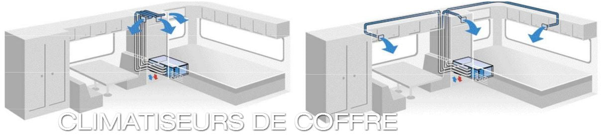 La climatisation de coffre comme son nom l'indique s'installe dans le coffre de votre camping-car. Vous pouvez également l'installer sous les banquettes du véhicules pour un gain de place. L'air est diffusé par des tuyaux visibles ou invisibles, selon le modèle, en hauteur et l'aspiration de l'air se fait au sol.