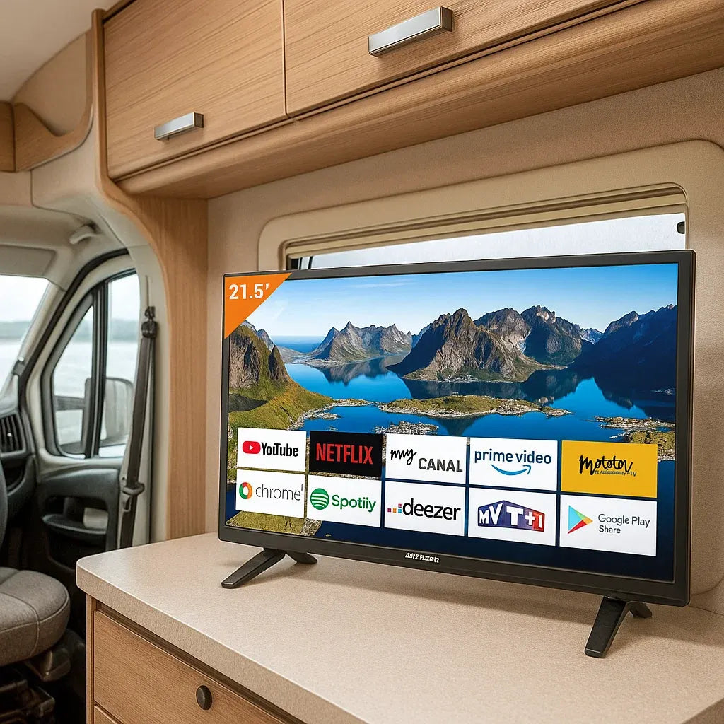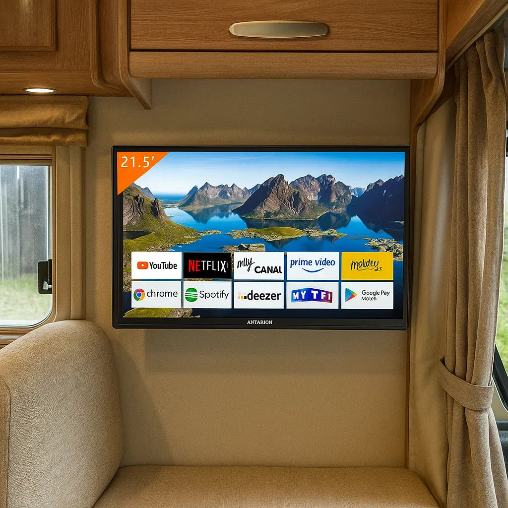 La TV connectée Android 22’’ Antarion a été spécialement conçue pour offrir un confort de vision et une connectivité optimale aux voyageurs. Compacte et légère, elle s’intègre parfaitement dans tous les camping-cars, vans ou fourgons aménagés, tout en garantissant une image Full HD d’une grande qualité.