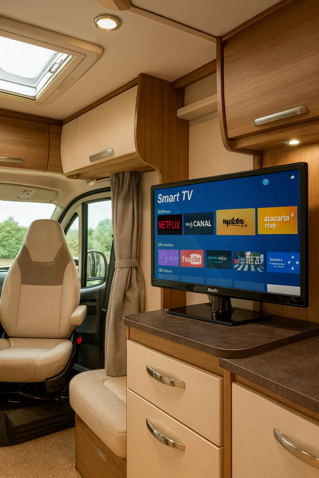 Ces télévisions pour camping-car sont plutôt pensées pour consommer peu. Ce type de modèle consomme autour de 15-20 W. Cela reste raisonnable, mais si vous utilisez la TV longtemps sans recharge (panneaux solaires, alternateur, réseau de camping), il faudra surveiller l’état de la batterie.